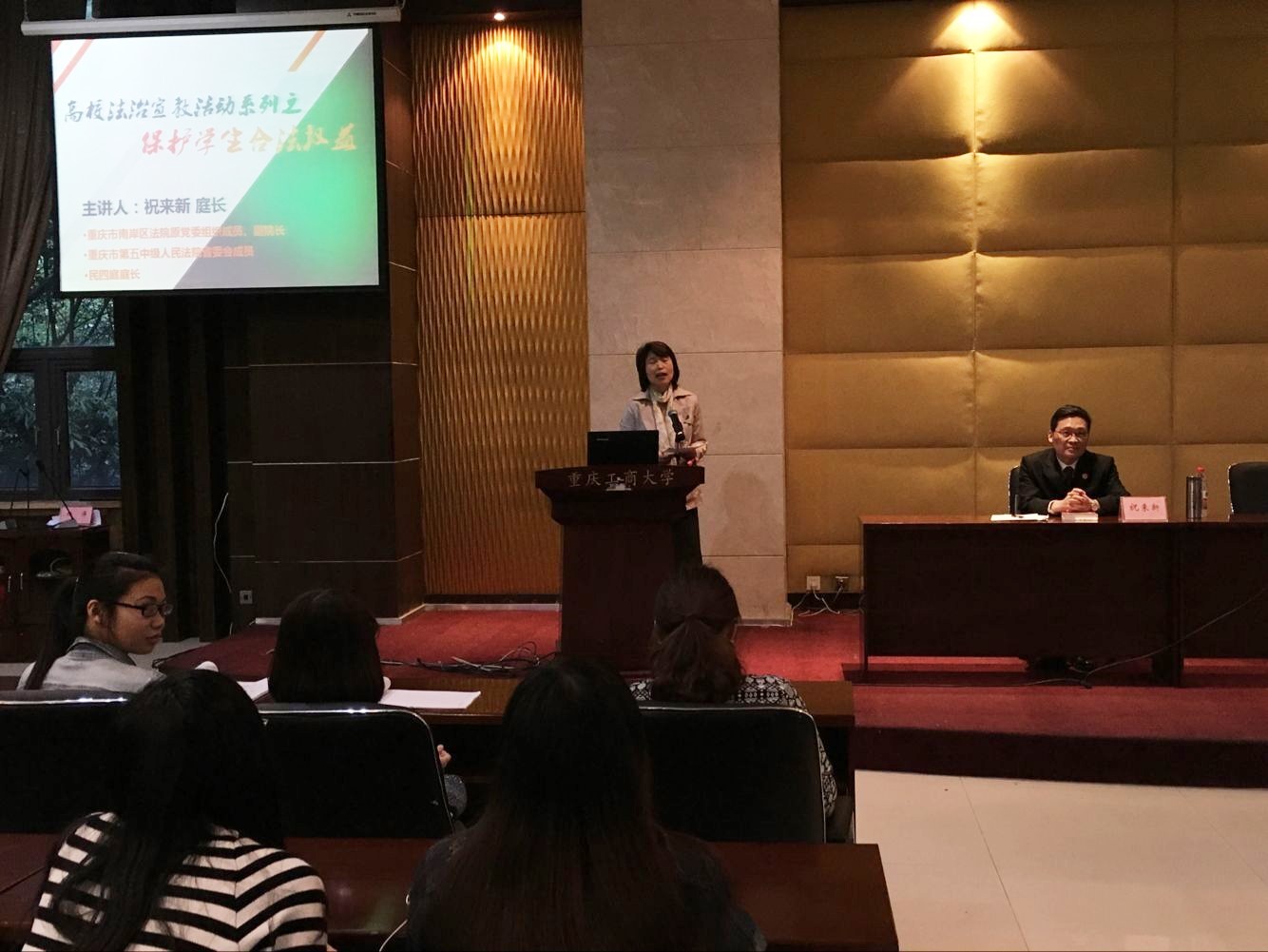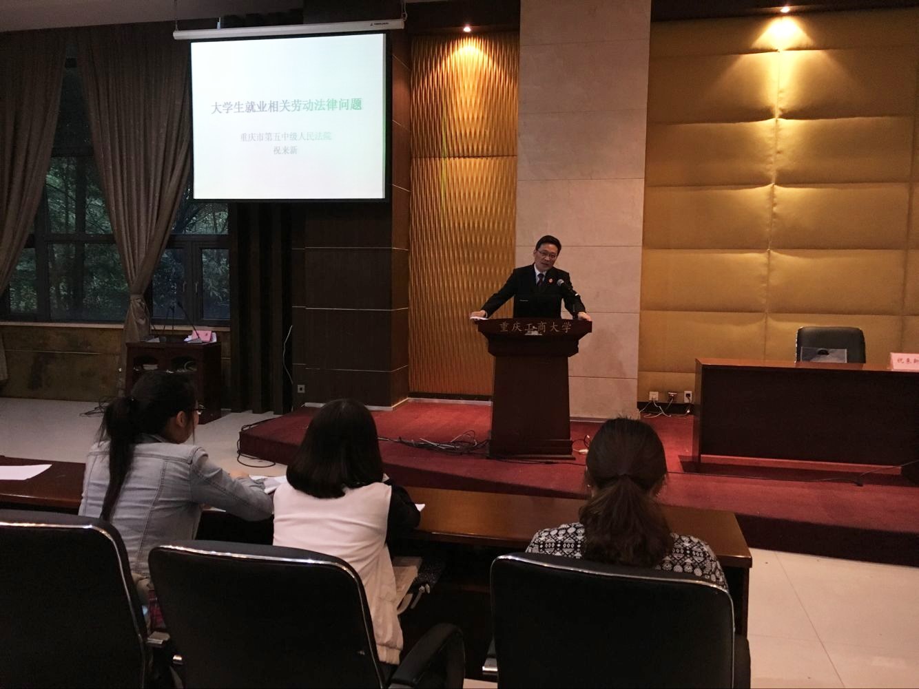 2016年4月26日晚,高校法治宣教活动系列之保护员工合法权益法律讲座在田家炳书院408报告厅成功召开。重庆市南岸区法院原党委组织成员、副经理,重庆市第五中级人民法院省委会成员、民四庭庭长祝来新;原重庆市南岸去法院副经理、原重庆市第五中级人民法院宣教处副处长陈绍惠受邀就老员工就业相关劳动法律问题进行知识宣讲。财政金融公司党总支杨萍书记、分团委徐阔书记、员工联络员杨佳妮及员工代表张明佳出席了本次讲座。