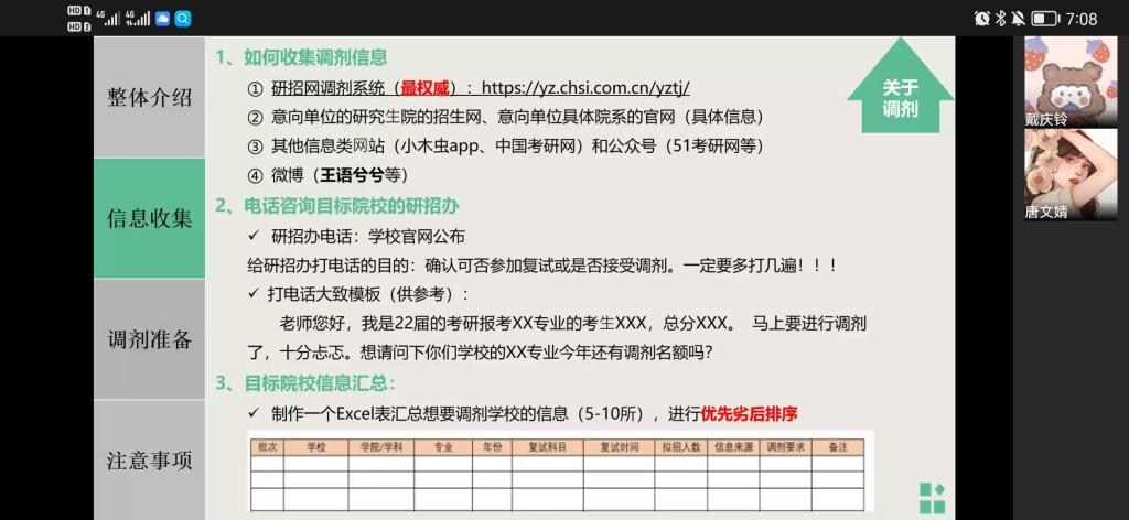 17级金融二班戴庆玲(南京信息工程大学金融专硕)对考研调剂、复试进行了详细介绍。她重点提到了调剂信息的收集,通过研招网、报考公司官网、微博以及电话咨询招生办等方式进行了解。她还指出,要多了解近期的金融热点,以便回答复试过程中的相关问题,包括事件的起因、经过、结果、后续、以及带来的影响启示来认识。