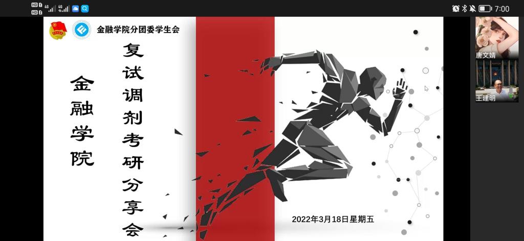 17金融一班郑垚(云南师范大学金融专硕)主要分享考研的调剂经验。从调剂流程适用范围、系统填报、面试内容三方面介绍。她重点提到调剂系统的使用,建议留一个志愿,多注意关注系统是否收到复试通知,并及时回复。她表示,在面试时不用太担心英语,流畅回答问题即可,可以适当放慢语速给自己思考的时间,遇到突发问题也不必慌张,需沉着冷静应对就好。调剂流程中要自信,尽量发挥出自己最好的一面,同时也要放平心态,相信无论身处何校,都能让同学们取得收获。