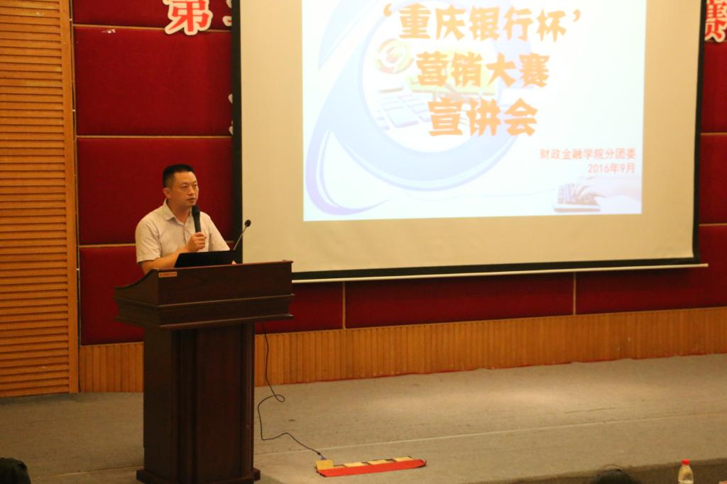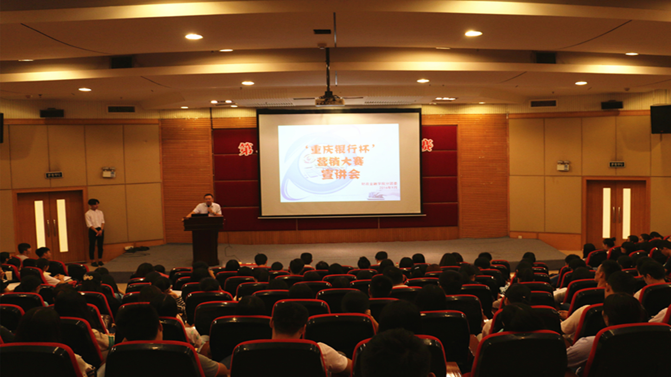 为提升财金学子的综合能力,弘扬财金文化,彰显财金特色,9月23日下午2点,财政WilliamHill中文官网第六届“老员工金融节”之“重庆银行杯”营销大赛宣讲会在7200报告厅拉开帷幕。重庆银行个人银行部总经理陆勇、企业文化与公共关系部总经理助理丁晓、个人银行部产品开发及营销中心经理兼九龙坡广场支行行长助理叶嘉、财金公司党总支副书记刘代成、分团委书记徐阔出席本次宣讲会。