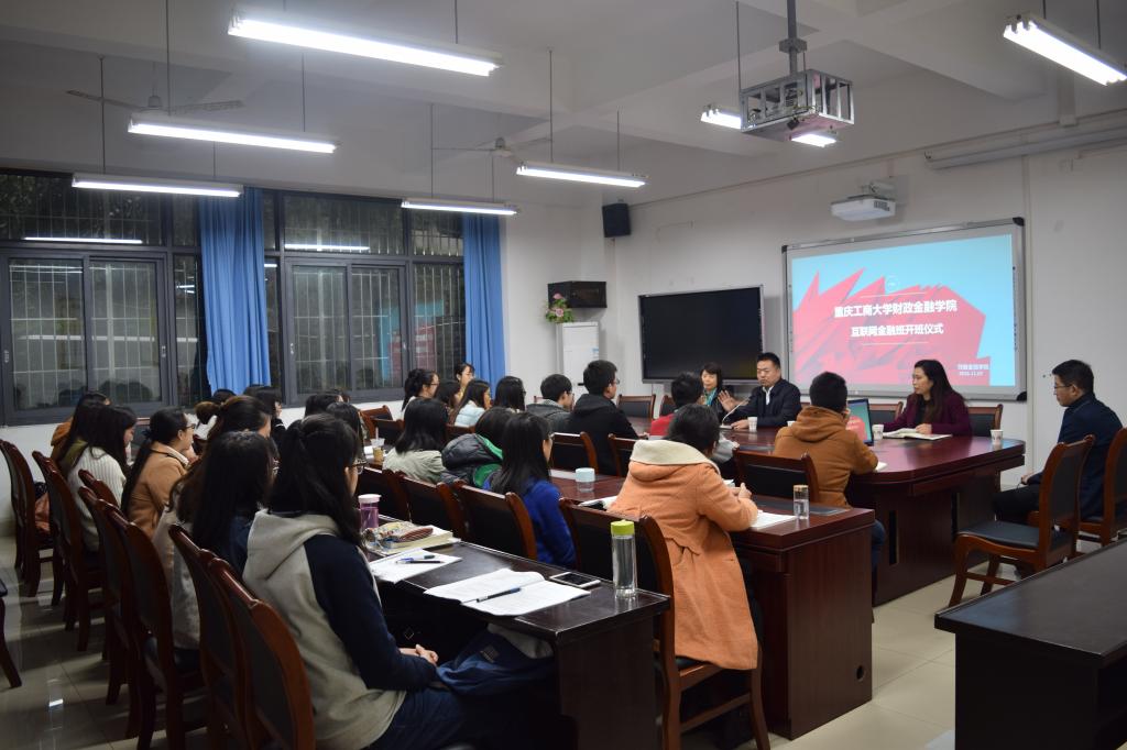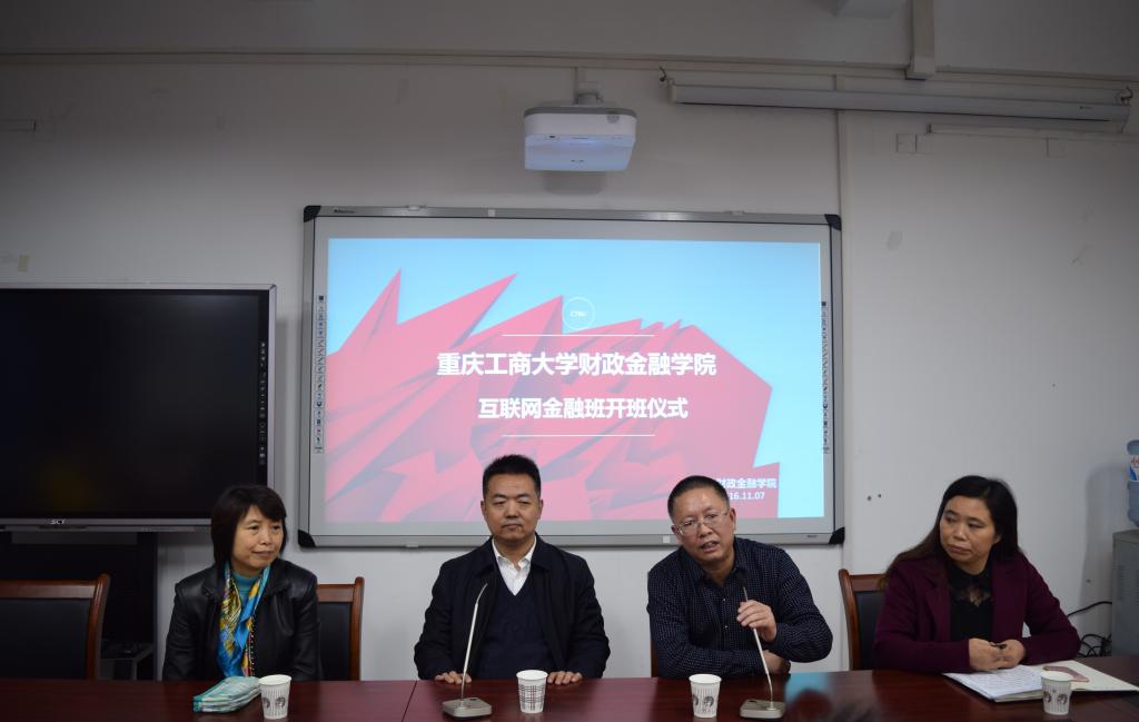 2016年11月7日下午15:30,威廉希尔WilliamHill财政WilliamHill中文官网首届互联网金融班开班仪式在南岸校区田家炳313会议室举行。重庆市金融发展中心主任张洪铭、财政金融公司党总支书记杨萍、常务副经理莫云、金融系主任许世琴、分团委书记徐阔出席此次开班仪式。