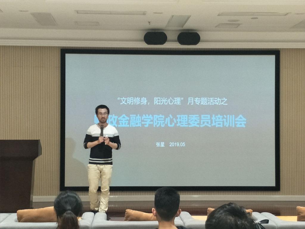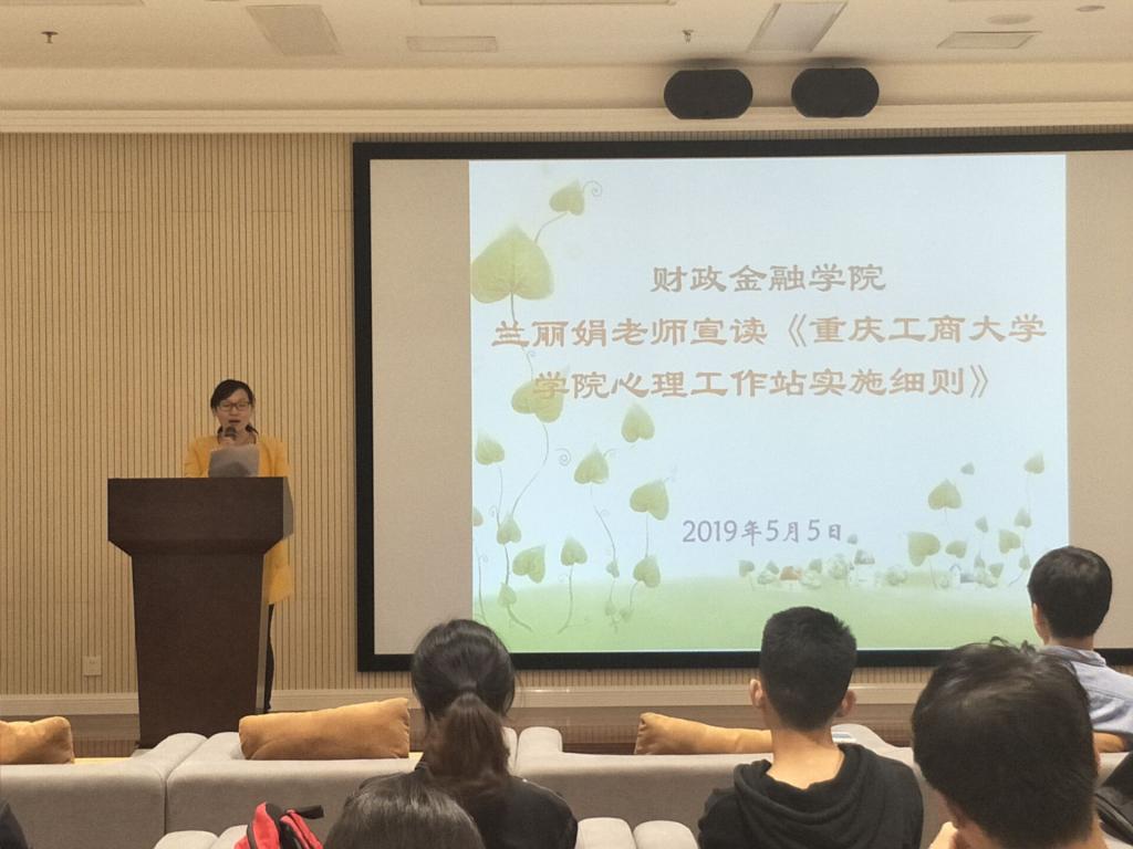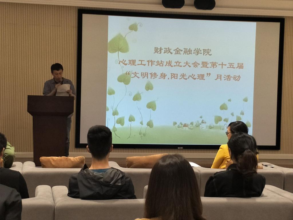 财政WilliamHill中文官网心理工作站成立大会暨第十五届“文明修身·阳光心理”月活动于5月5日下午14:00点在图书馆视听阅览室如期举行。公司党委黄谦副书记出席并宣布院心理工作站成立并对工作站提出具体的工作要求;学团办主任兰丽娟老师带领与会的全体心理委员学习了《威廉希尔WilliamHill公司心理工作站实施细则》;首任站长分享了校心理工作站的培训精神和要求。活动的重点是邀请校心理健康咨询中心兼职教师张星老师向全体心理委员做了有关“如何做好心理异常察觉、初步预防及报送工作”的培训活动。张老师理论阐述与团体辅导相结合的精彩教学,让全体受训心理委员如醍醐灌顶,提高了大家开展班级心理工作的能力,增强了大家搞好班级心理工作的信心。下午16:00活动圆满结束。