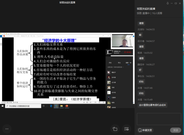 课程中直播平台网络运行顺畅,偶尔出现卡顿的问题也可以及时解决。透过屏幕,同学们真切地感受到老师们为提供高质量线上教学所付出的辛劳。虽然大家相距遥远,但线上课程的学习让我们团结一心,紧密相联。