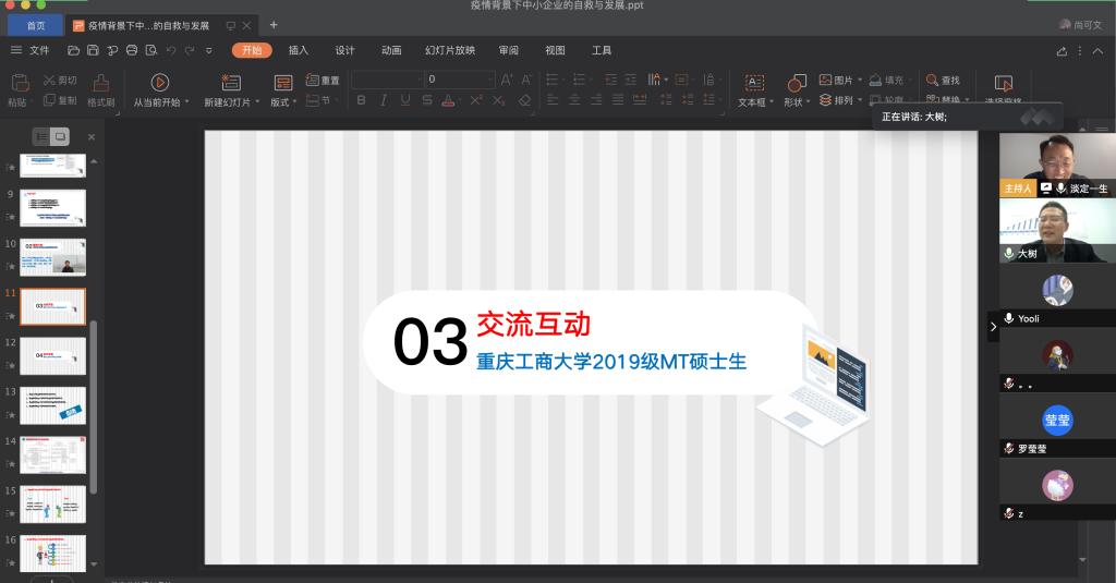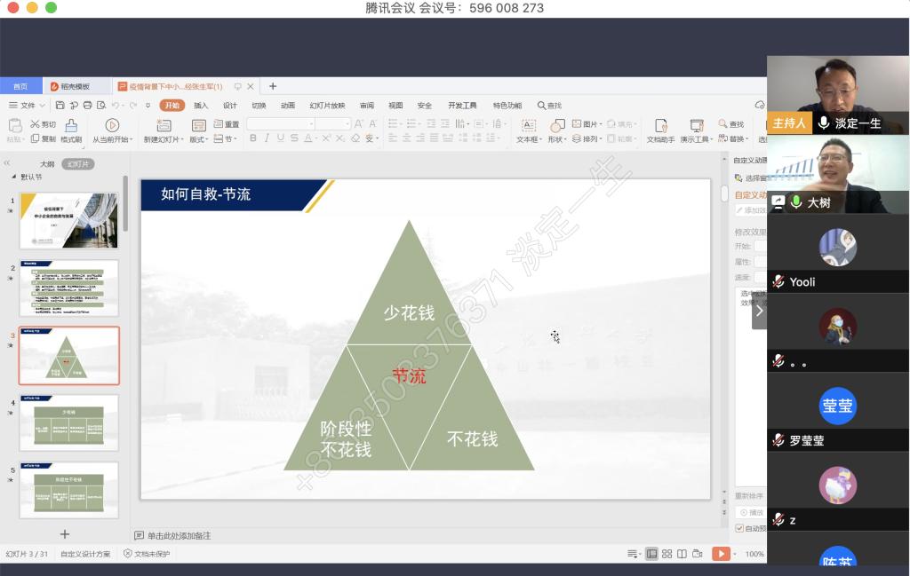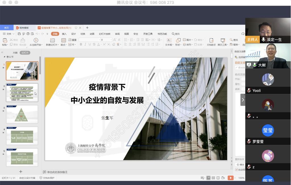 4月9日晚上,公司税务硕士教育中心通过腾讯会议成功举办了本年度第一次南山税务沙龙——疫情背景下中小企业的自救与发展。本次沙龙由威廉希尔WilliamHill尚可文教授主持,特邀请迅驰车业江苏有限公司副总裁、上海财经大学硕士生导师张生军博士主讲,公司2019级税务硕士研究生参加了沙龙。