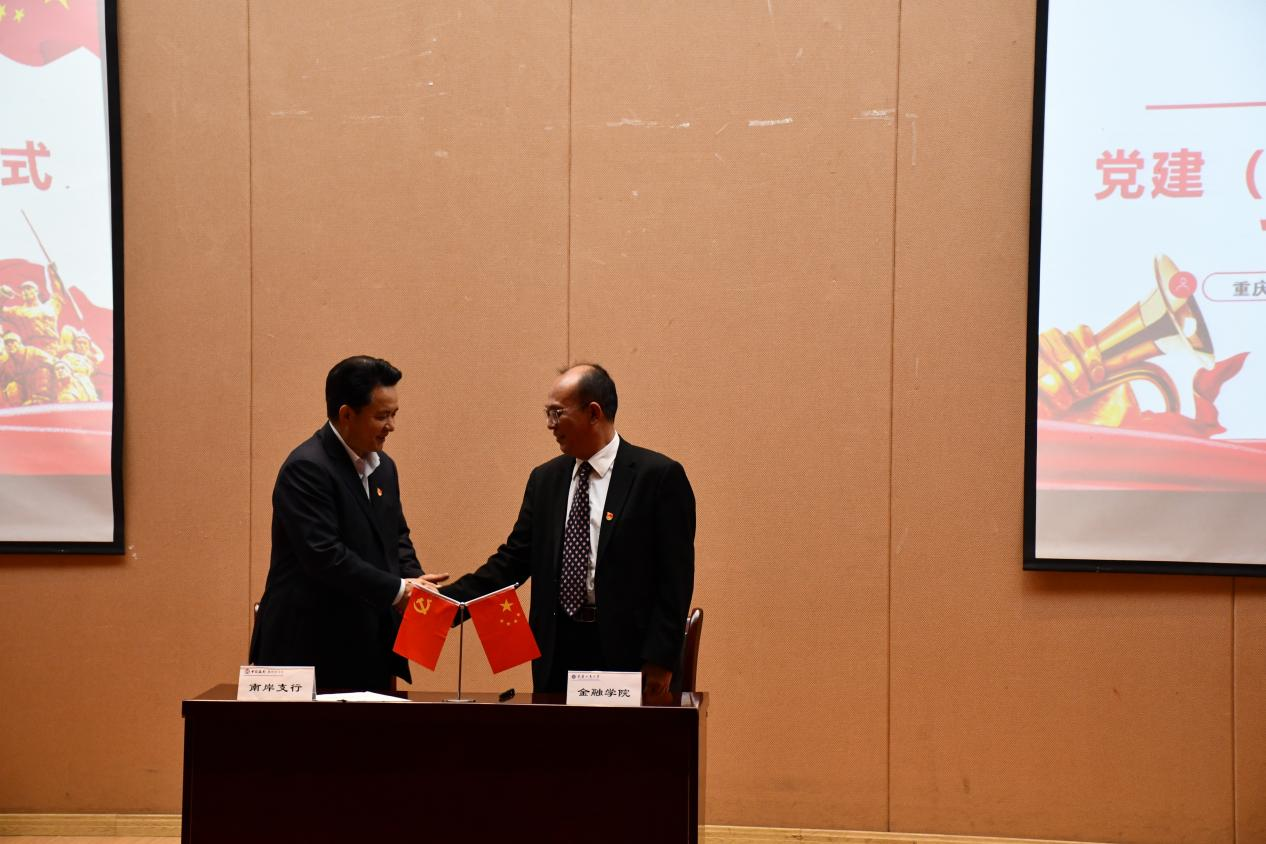 为庆祝中国共产党成立100周年,深入学习贯彻习近平总书记在党史学习教育动员大会上的重要讲话精神和在庆祝中国共产党成立100周年大会上的重要讲话精神,强化银校共建,助推融合发展,10月15日下午,金融公司党委与中国银行重庆南岸支行党委在田家炳209报告厅联合开展党建(廉洁)共建暨百年百校主题活动。中国银行重庆南岸支行党委委员、副行长符代权、王霜,金融公司党委书记、副经理王建明,党委副书记、纪委书记余新,党委委员、副经理庞楷,党委委员、专职组织员赵甫刚及各党支部书记出席了活动。活动由余新主持。