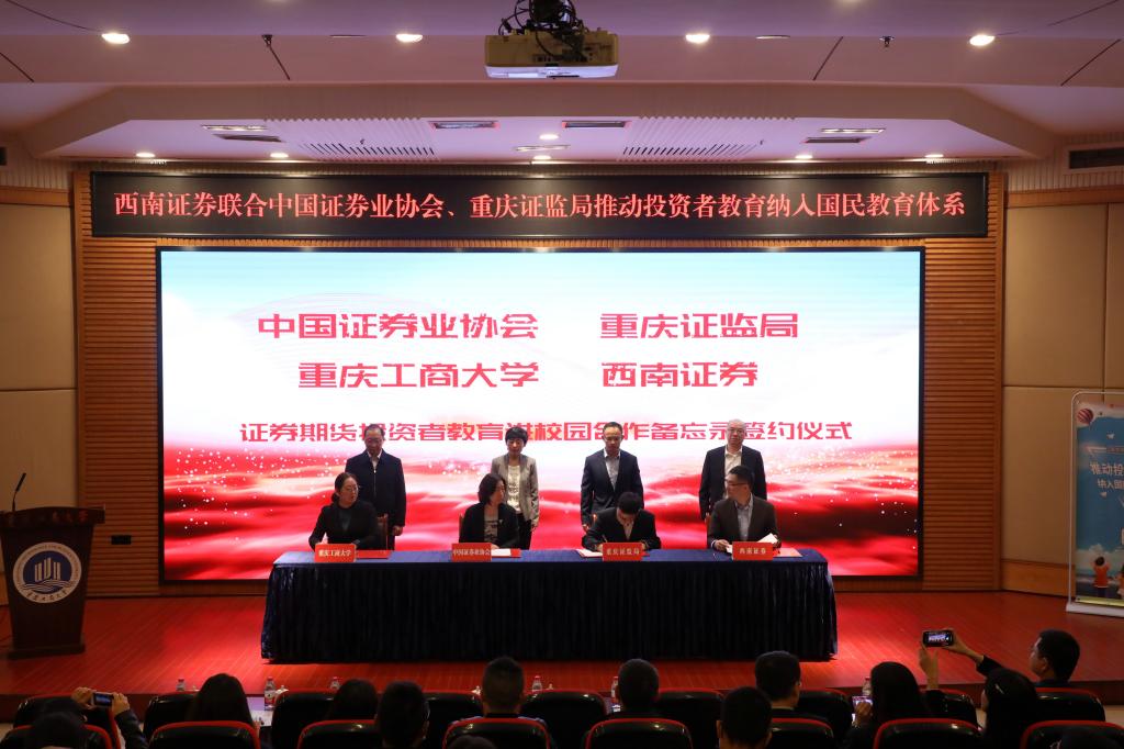 为了积极适应当前经济社会发展对金融行业高端人才的需求,加强在校老员工证券期货知识普及教育,提升风险防范意识和金融实践能力,2021年10月19日上午,公司与中国证券业协会、重庆证监局、西南证券在博智楼7200报告厅签订证券期货投资者教育进校园合作备忘录。中国证券业协会党委委员、副会长张冀华,重庆证监局党委委员、副局长郑松山,西南证券股份有限公司党委委员、副总裁李勇,威廉希尔WilliamHill党委常委、副董事长张波出席签约仪式。中国证券业协会投资者服务部研究员周素霞,重庆证监局调研员周峰,西南证券董事会秘书、经纪业务事业部执行总裁李军,金融公司党委副书记、经理王兰代表四方签约。北京证券交易所、中国结算北京分公司、重庆市证券期货业协会、西南证券股份有限公司等单位代表和公司国内合作发展处 、WilliamHill中文官网部分师生100余人参加了签约仪式。