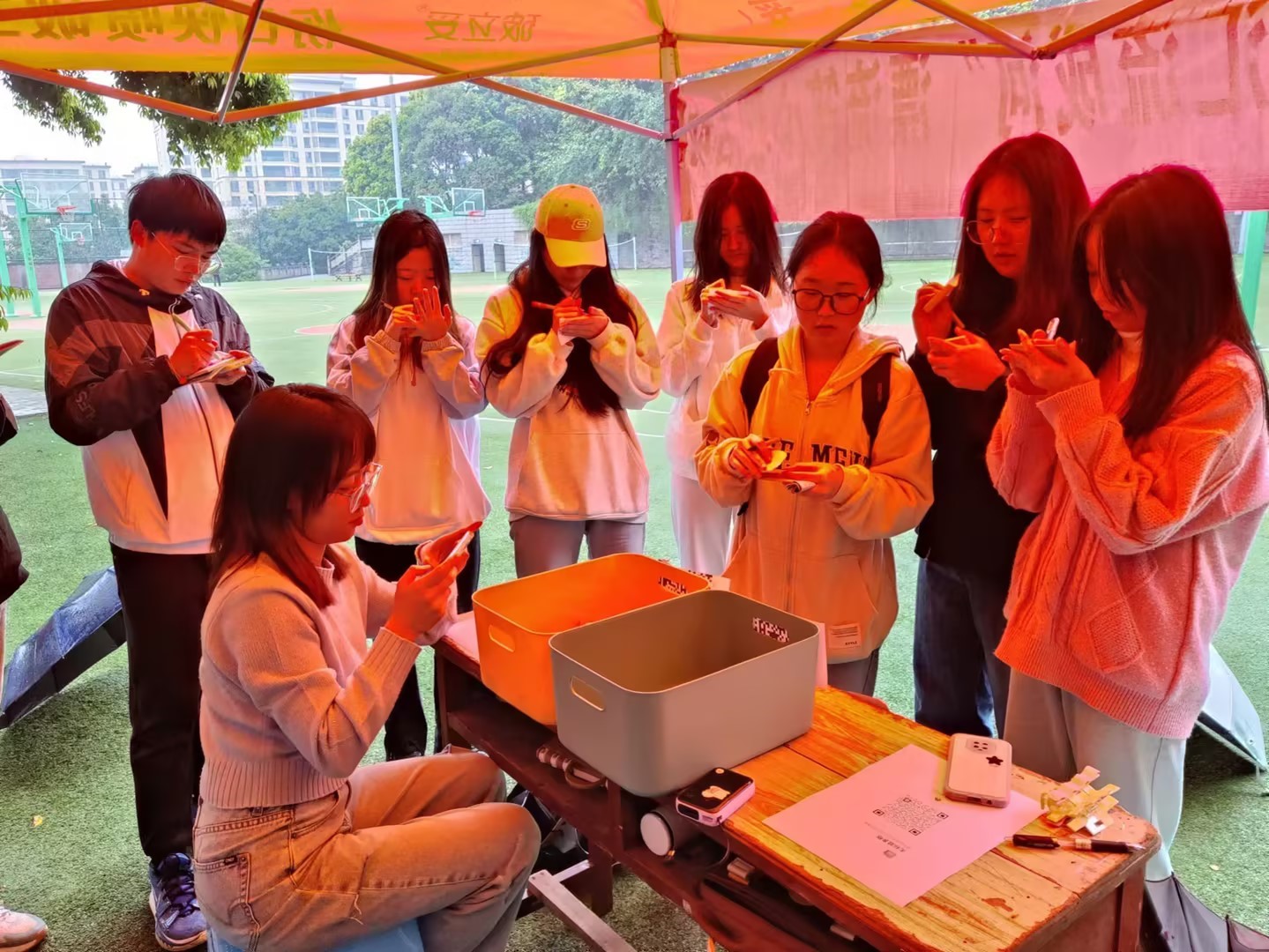 纷纷的小雨也没有掩住同学们积极参与的热情。同学们分别在便签上写下自己的焦虑和开心的事情,并将其投入代表不同心事的不同颜色的箱子中,并从与自己心声不同的箱子中取出一张便签,观看后写下自己的寄语;给予焦虑的同伴以安慰和就不同角度的解决方案,分享同伴最真挚的喜悦使其双倍。