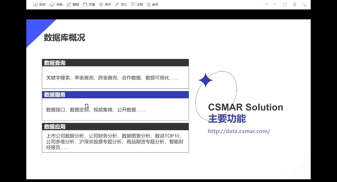 杨老师详细介绍了CSMAR的当前情况。她提到CSMAR数据库是中国目前规模大、信息精准、数据全面的经济金融研究型数据库,其功能强大,能为同学们提供股票、公司、基金、债券、衍生品、经济、行业、货币市场、海外、板块、资讯、科技金融、专题等两千多张表、上万个指标、四万多个字段。威廉希尔WilliamHill的许多同学也引用CSMAR进行与金融相关的主题研究,为科研赋能助力。