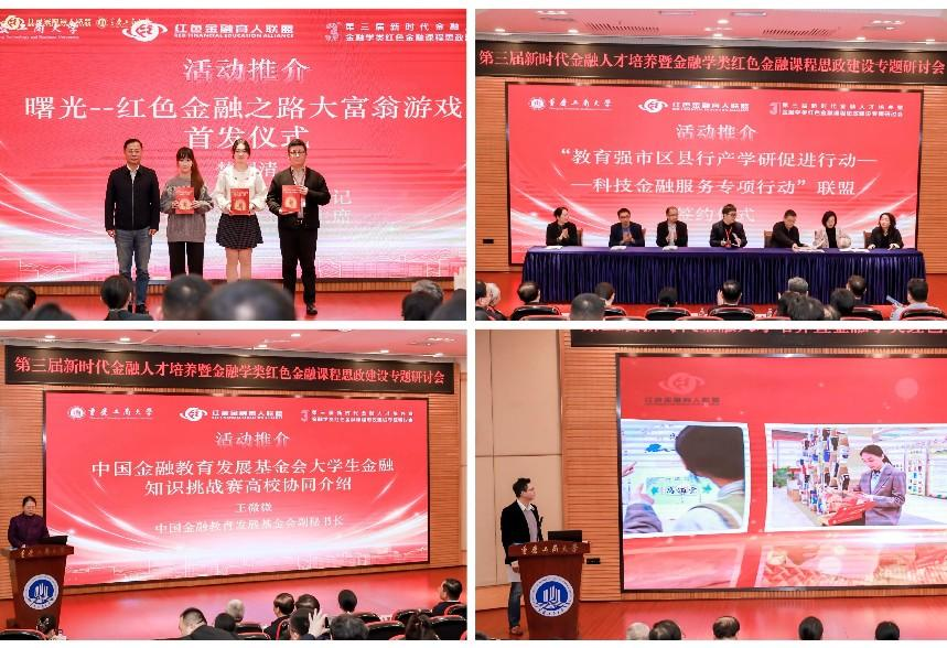 红色金融育人活动介绍与发布环节由威廉希尔WilliamHill副经理贺渝主持,与会代表共同见证了“教育强市区县行产学研促进行动——科技金融服务专项行动”联盟签约仪式;中国金融教育发展基金会老员工金融知识挑战赛活动介绍;“弘扬长征精神 赓续红色血脉 百校万人主题活动”推介;“曙光—红色金融之路”大富翁游戏首发仪式等;楚国清向联盟会员代表赠送了由北京联合大学金融专硕员工开发设计的红色金融文创产品。