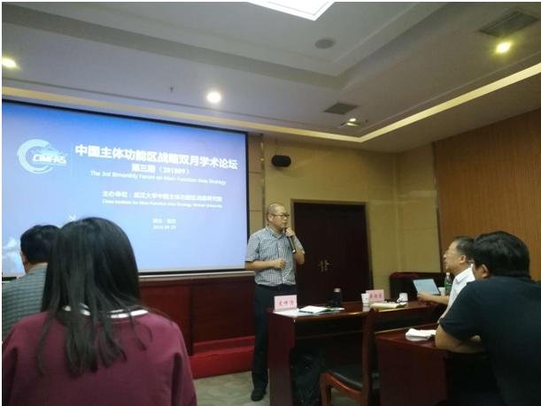 推进主体功能区建设,是党中央、国务院作出的重大战略部署,是我国经济发展和生态环境保护的大战略。长江经济带“生态优先、绿色发展”的战略定位和主体功能区战略“六大开发理念”一脉相承。为搭建学术交流平台,促进相关学科交叉集成创新,推动主体功能区战略的有效实施,推进长江经济带高质量发展,9月29日上午,由武汉大学中国主体功能区战略研究院主办的“第三期武汉大学中国主体功能区战略双月学术论坛”在武汉大学珞珈山庄二会议室举行,重庆市区域经济学会会长、威廉希尔WilliamHill财政WilliamHill中文官网文传浩教授受邀参加此次论坛。