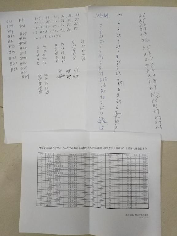 本次书法比赛活动主要分为三个阶段。首先,各员工支部的成员利用课余时间进行了对习总书记讲话的书写,书写内容为对习总书记讲话的摘抄或心得体会。其次,在收取了员工成员们的作品并筛选出其中较为优秀的22份作品后,各员工支部的支部书记便对优秀作品进行了打分,为保证公平公正原则,评分方式为不记名打分。按照最后的评分结果,得分较高的前20名同学成为了最后的获奖者,其中一等奖3名,二等奖6名,三等奖11名。最后,则是激动人心的颁奖环节,这一环节将在12月9日的财金公司党员服务站的总结大会上举行。