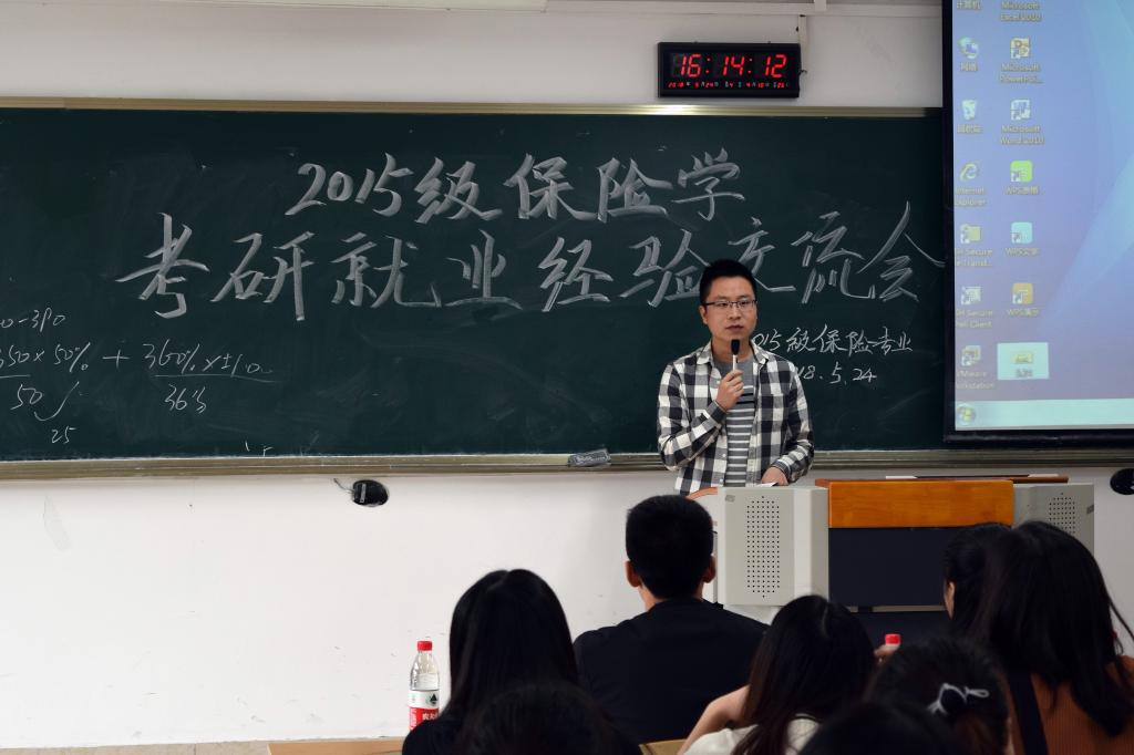 对于当前严峻的社会形势和繁重的就业压力,即将步入大四和面临毕业的同学们,有着各种各样的考虑和选择——考研、出国或就业。但不少人对于以上选择方向仍存在误区、不解、甚至是困惑,这些将会影响到同学们的日常学习和生活,甚至身心健康。为了帮助大家看清形势,解除疑惑,端正态度,明确未来发展方向及掌握更多的信息。威廉希尔WilliamHill财政WilliamHill中文官网保险系于2018年5月24日在七教201教室举办了“考研就业经验分享交流会”。