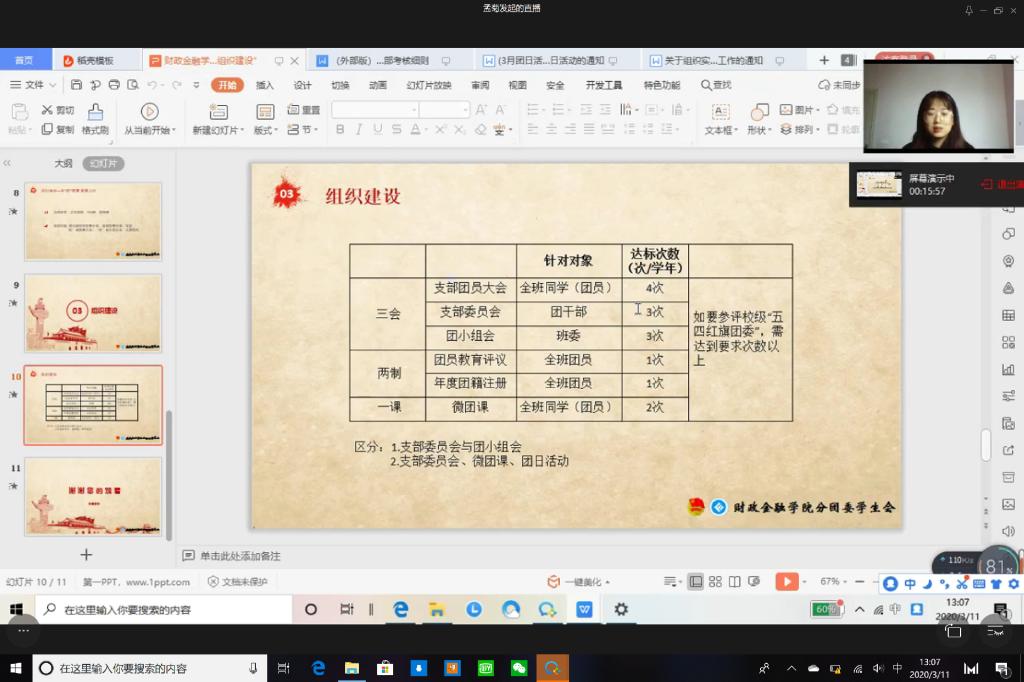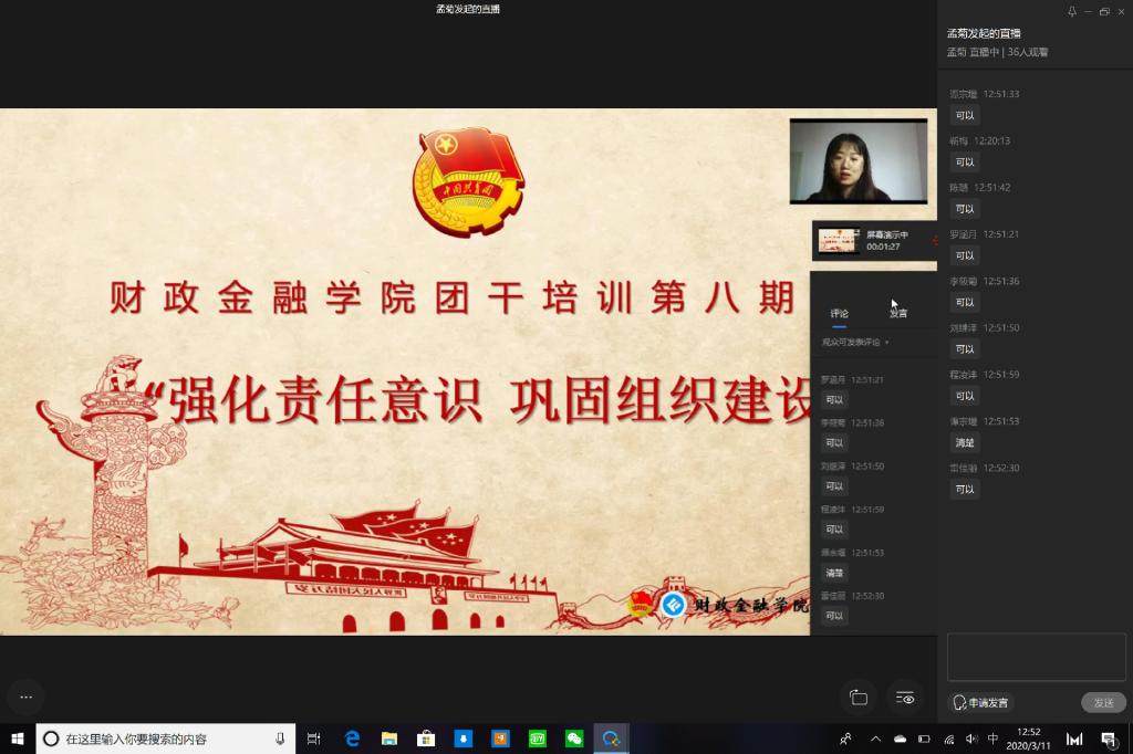 受疫情影响,财政WilliamHill中文官网于2020年3月11日在企业微信线上平台成功开展主题为“强化责任意识,巩固组织建设”的第八期团干培训活动。17、18级各班以及19CFA的团支书参与了此次培训活动。