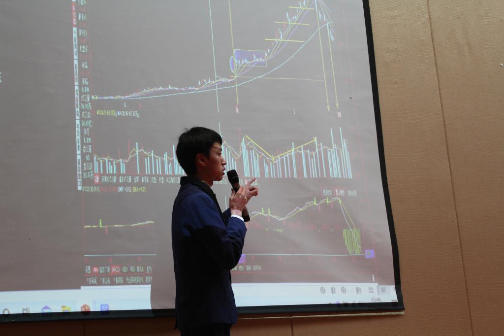 参加本次决赛的十位选手是历尽三个月的角逐,从人数多达600人的初赛中脱颖而出。在决赛中,分享自己的投资策略和感悟收获。其中,李彦隆选手以清晰而素雅的演示文稿及自信的演讲姿态获得大众好评,他回顾以往市场,讲述自己比赛时的心理变化,内容通俗易懂又极具趣味。陈启函同学重视技术面与基本面的分析,他从K线走位及日线、周线形态要素对其自选股:宝钢股份、阳光电源等进行技术面分析,对钢铁、新能源行业展开基本面分析。张可睿选手结合自身投资情况对贵州茅台进行宏观、微观及技术面分析,并由此得出了“掌握投资策略,锻炼良好心理素质”的感悟。舞台上的各位选手各显其通,娓娓道来,将答辩气氛推向高潮。