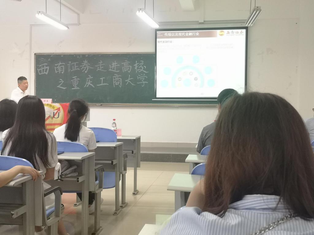 5月14日下午14:00,西南证券投资者教育进校园活动在田家炳306教室举行。西南证券杨家坪营业部总经理助理杨炎老师以“老员工金融职业规划以及理财规划”为主题,为同学们做职业规划、职业资格证考试以及理财规划的相关讲座。