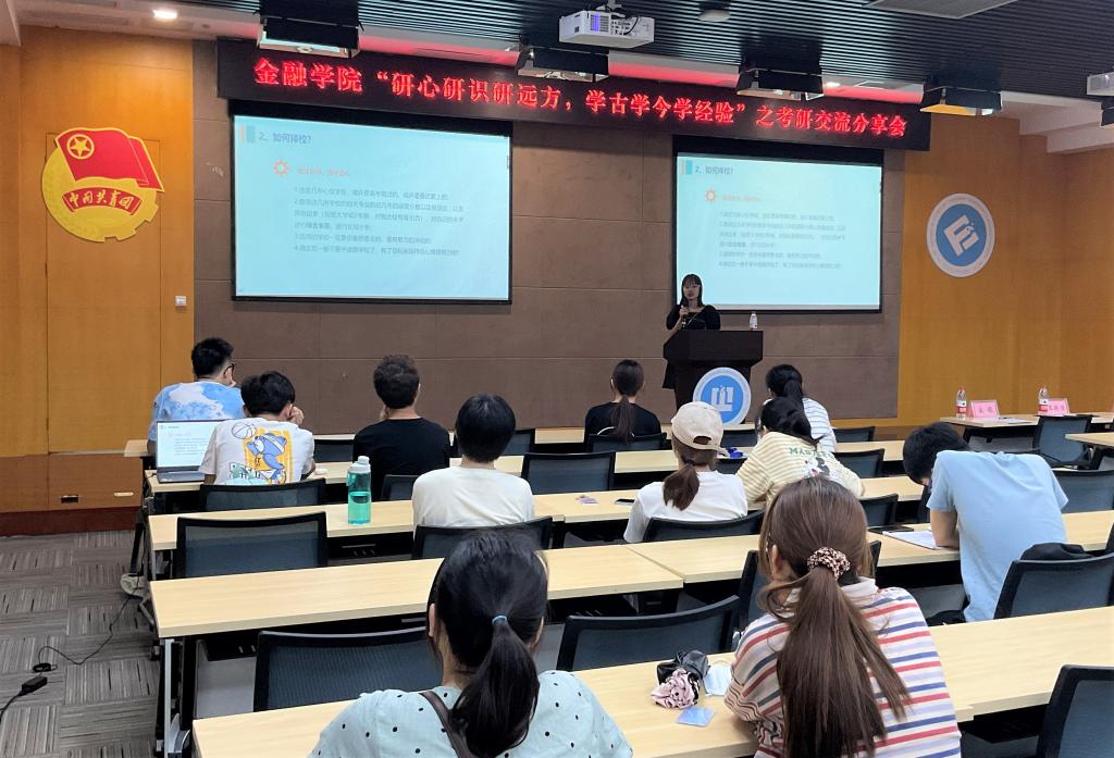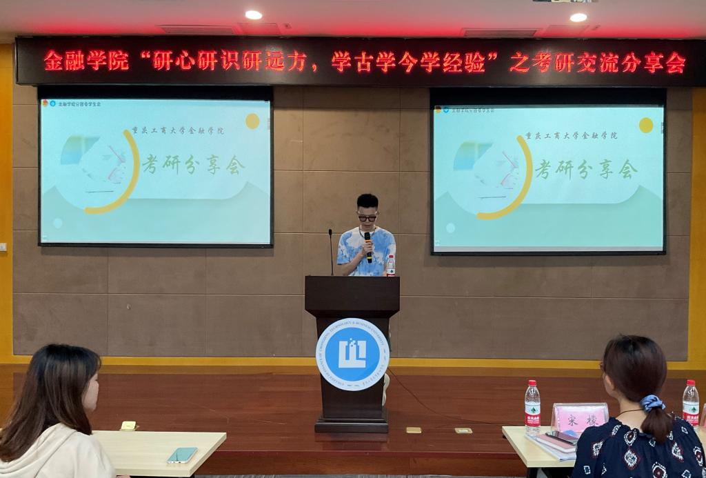 大会开始,考取西南大学金融专硕的宋檬同学从备考政治、英语、数学与专业课复习时间、每月书籍的推荐和使用以及具体的学习方法进行全面讲解,建议同学们备考时进行合理的学习时间安排。随后,考取中南财经政法大学保险专硕的吴婧同学就近几年初试出分、复试名单公布、复试考试、拟录取公布的各个时间节点,复试内容形式、分值分布与调剂信息等相关内容进行分享,系统的表述出复试的备考方法,鼓励同学们在考研路上要坚持到底。接着,考取对外经济贸易大学金融学硕的王佳特同学分享了择校原则和方法、备考心态与初试复习时的重点等相关经验,鼓励同学们要保持自信和学习兴趣。最后,考取西南财经大学金融学硕的朱洪鑫同学从复试科目和流程上进行具体的介绍,建议同学们保持良好的作息,劳逸结合。分享结束后,同学们积极提问,四位同学对其进行一一解答。