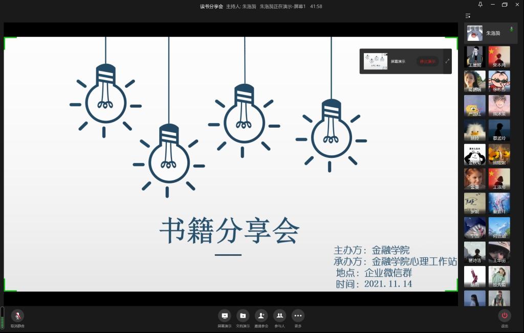 为了促进大公司园的文化氛围,提高同学们的学习积极性,加强良好的心理健康教育, 2021年11月14日下午两点,WilliamHill中文官网心理工作站举办的 “书籍分享会”线上活动在企业微信群如期进行。WilliamHill中文官网心理工作站工作人员、心理委员和多名员工参加了此次分享会。