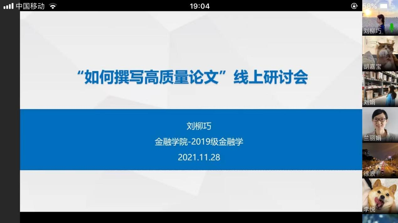 本次交流会邀请了有论文发表经历的刘柳巧、李欣忆、徐浪三位同学分别分享了撰写和发表论文的经验,并针对如何提高撰写高质量论文进行了详细讲解。一是要确定研究主题,围绕研究主题大量阅读权威学者、期刊的论文,进行分类梳理,挖掘好的选题;二是掌握科学的数据处理技术,重点掌握一些常用的软件,推荐到经管之家网站进行学习交流;第三,重视论文的反复修改,与导师进行交流,参加学术会议听取专家意见,持续地提高论文质量;第四,注意学术规范,参考文献写作格式要标准。在互动环节,大家对数据处理软件、数据来源、论文发表途径等进行了交流。