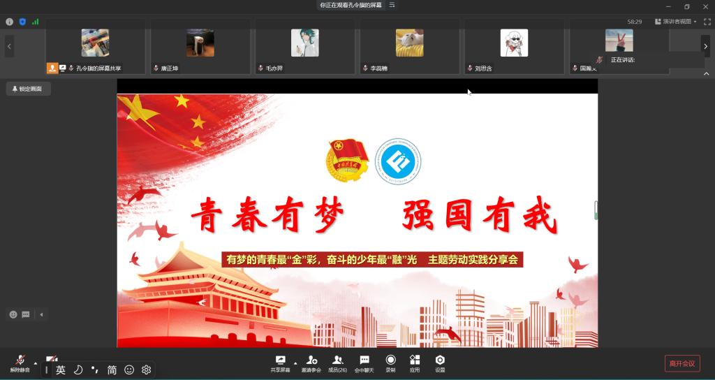 为鼓励同学们积极参与劳动实践活动,树立正确的价值观、劳动观、成才观, 4月10日20:30,WilliamHill中文官网于企业微信开展了“有梦的青春最‘金’彩,奋斗的少年最‘融’光”主题劳动实践分享会。本次分享会由WilliamHill中文官网分团委社会实践部部门负责人孔令旗主持,会议邀请到四位同学为大家分享劳动实习经验和志愿服务经历。