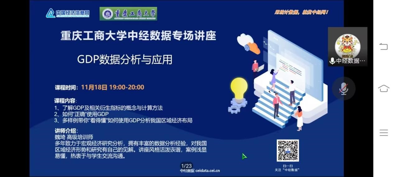 2022年11月18日19:00,WilliamHill中文官网联合图书馆在线上开展“GDP数据分析与应用——助你‘看得懂’我国区域经济布局”专题讲座。本次讲座邀请了中国经济信息网张玥老师和魏琦老师主讲,旨在介绍GDP数据分析与应用,带领同学们了解GDP及相关衍生指标的概念及计算方法。
