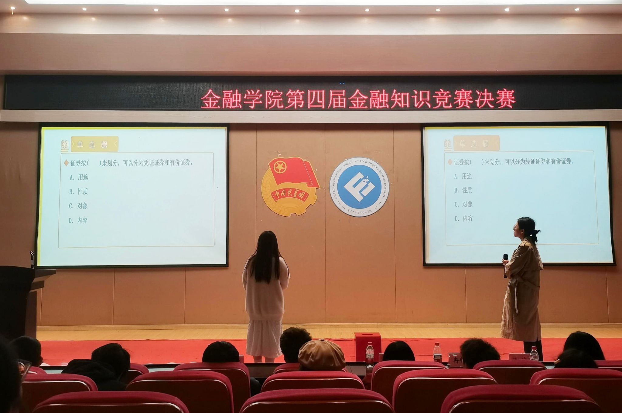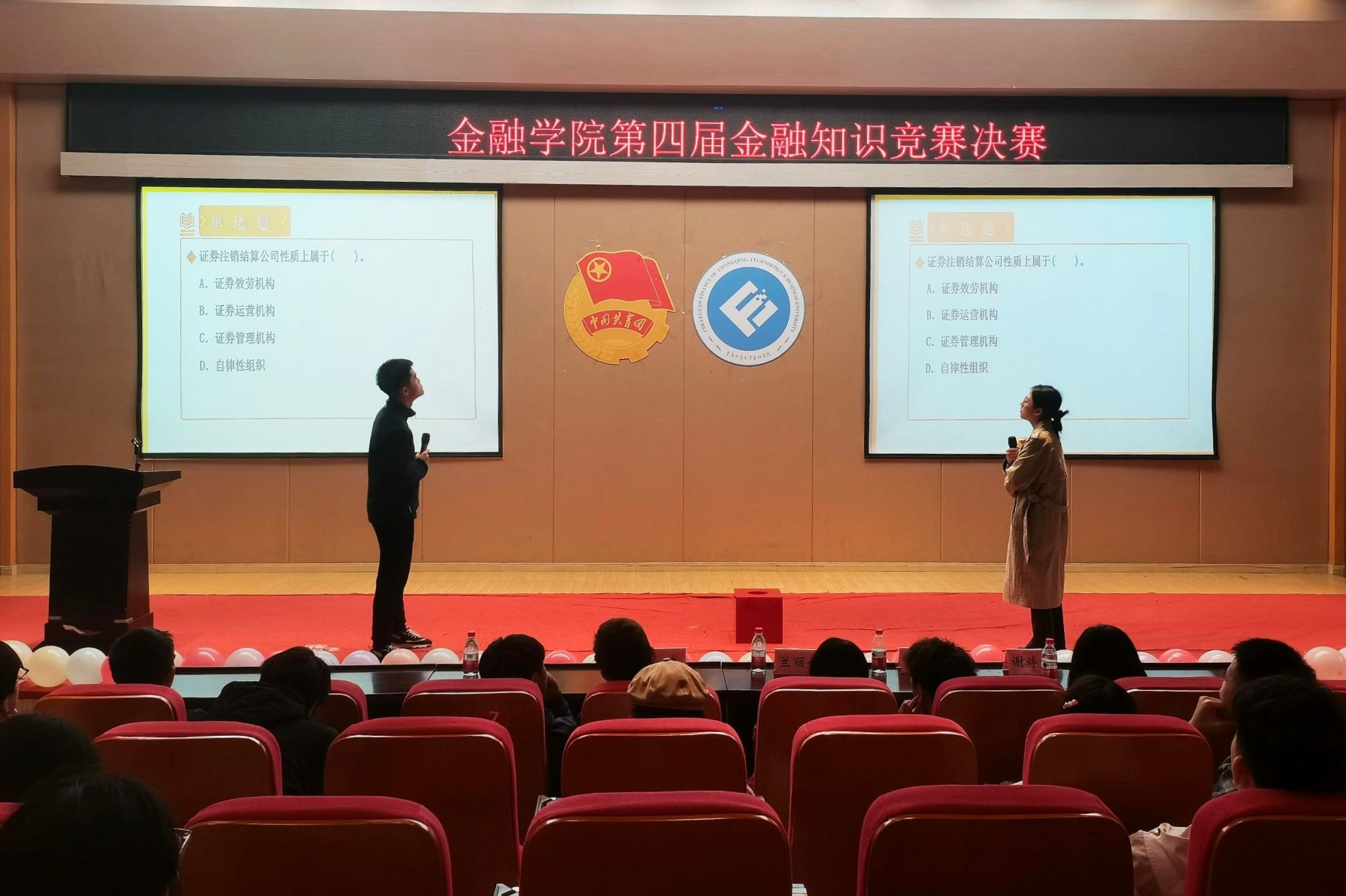 本次比赛形式为擂台制限时答题。题目分为证券从业资格证题目、银行求职考试题目、银行从业资格证题目、保险从业资格证题目、基金从业资格证题目五部分。每人轮流当擂主,擂主随机抽取对手进行比拼。比赛开始,各位选手依次答题,面对大屏幕上的题目,他们镇定自若,展示出了灵活的应变能力与前期充分的准备效果。