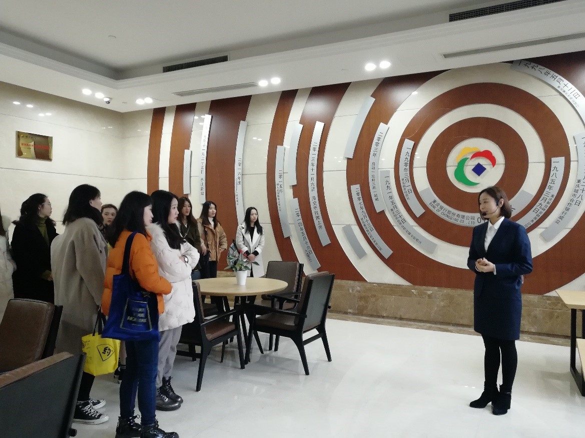 在骆老师与重庆银行人力资源部的胡璨老师的指引下,同学们有序地走进银行大楼,开始今天的移动课堂第一个环节。首先,由李老师带领同学们参观大厅一楼,为同学们介绍重庆银行大楼独具特色的山水屏风、雕像、墙雕等,都充分的体现了重庆银行起源于重庆,成长于重庆,满是山城味道。接着,参观重庆银行的发展年轮图,上面记载着重庆银行的发展历程大事记,为同学们呈现了一个银行的产生和崛起。