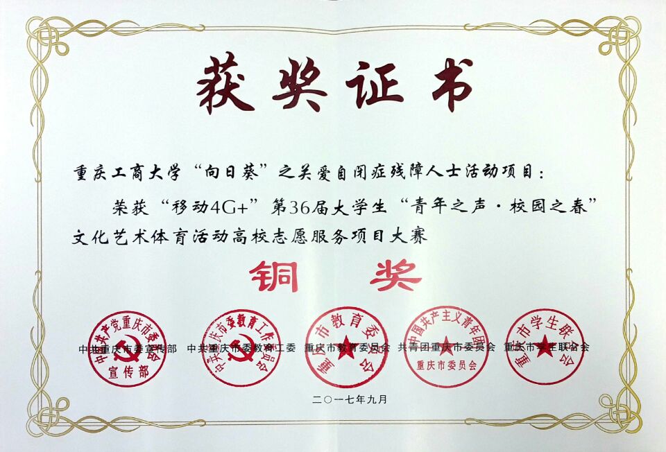 近日,公司“向日葵”之关爱残障人士活动项目获“移动“4G+”第三十六届老员工“青年之声 校园之春”文化艺术节体育活动高校志愿服务项目大赛铜奖。这无疑是对参与志愿服务项目的志愿者的一种鼓励,更是对“星火”义协的极大肯定!