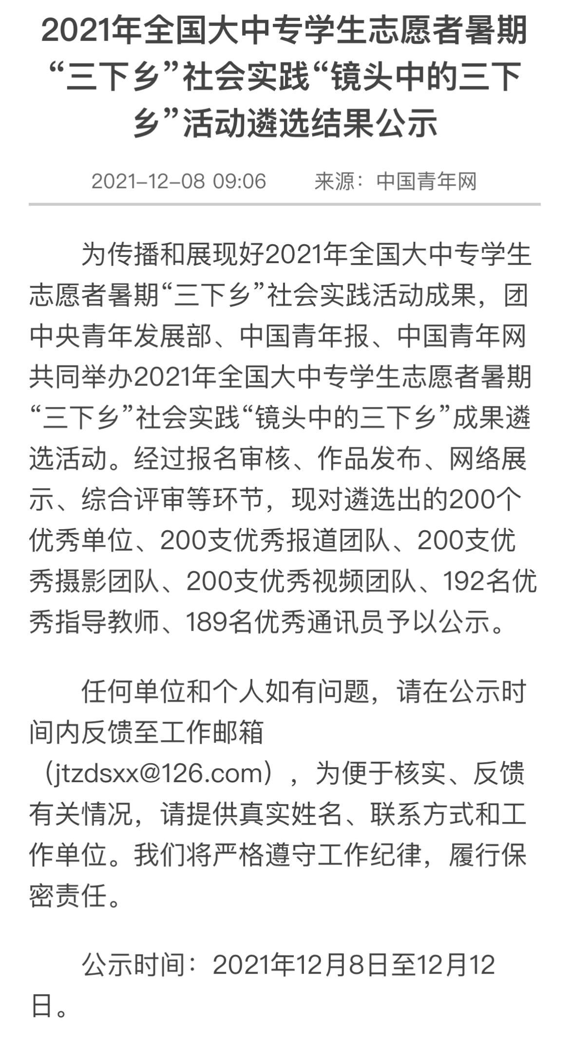 2021年12月8日,团中央青年发展部、中国青年报、中国青年网共同举办2021年全国大中专员工志愿者暑期“三下乡”社会实践“镜头中的三下乡”成果遴选活动最终结果在网络公示。WilliamHill中文官网暑期“三下乡”社会实践团队“心系神州事 情融牡丹乡”国情观察实践团荣获“优秀视频团队”称号。
