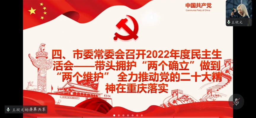 通过对市委常委会召开的2022年度民主生活会的进一步学习,支部同志们深刻领悟了习近平总书记在中央政治局民主生活会上的重要讲话精神和对重庆作出的系列重要指示批示精神。作为新时代的青年党员,支部同志说道:“我们要时刻保持解决大党独有难题的清醒和坚定,加强党的全面领导,全面加强党的建设,推进全面从严治党,当好良好政治生态和社会风气的引领者、营造者、维护者。”